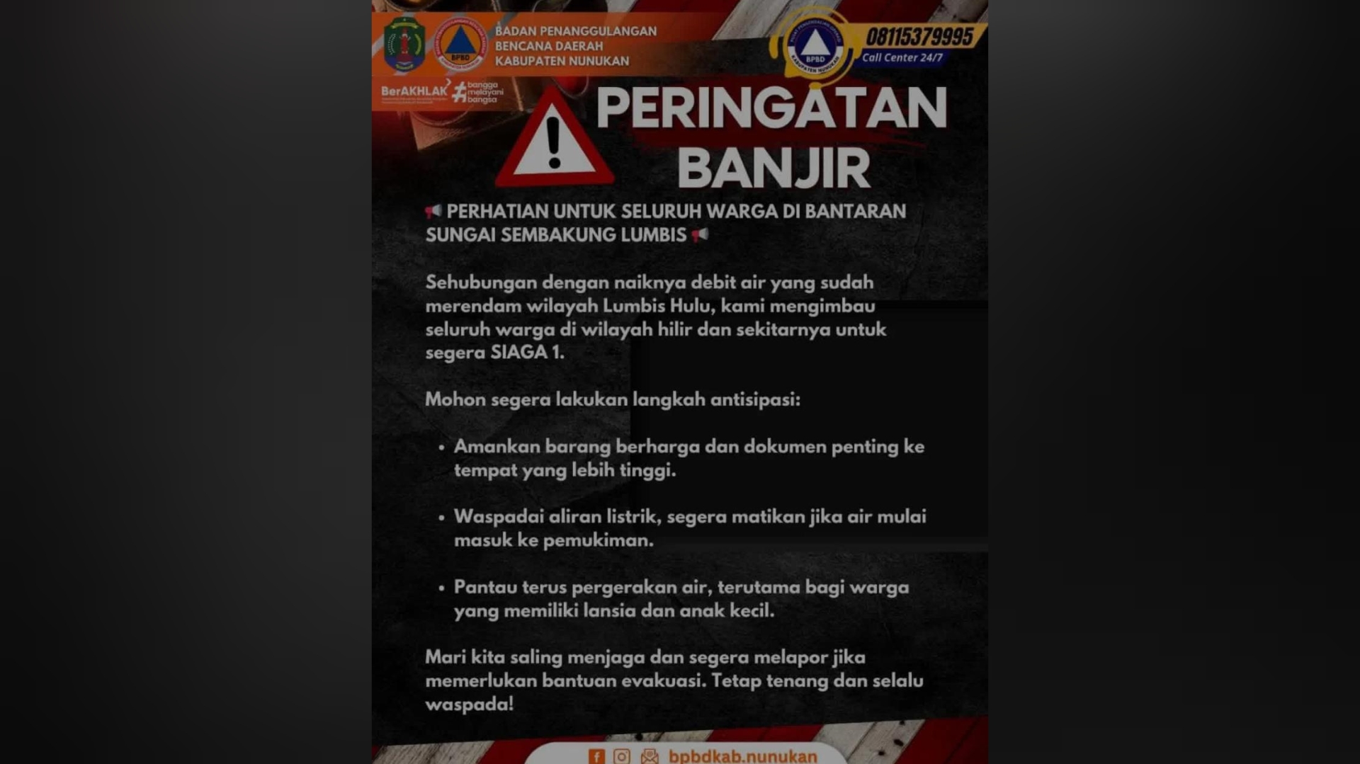 NUNUKAN, KN – BPBD Kabupaten Nunukan, Kalimantan Utara, mengeluarkan peringatan darurat bagi seluruh warga di bantaran Sungai Sembakung Lumbis. Luapan air saat ini telah merendam wilayah Lumbis Hulu. Kondisi tersebut menuntut warga di wilayah hilir dan sekitarnya segera menetapkan status SIAGA 1.