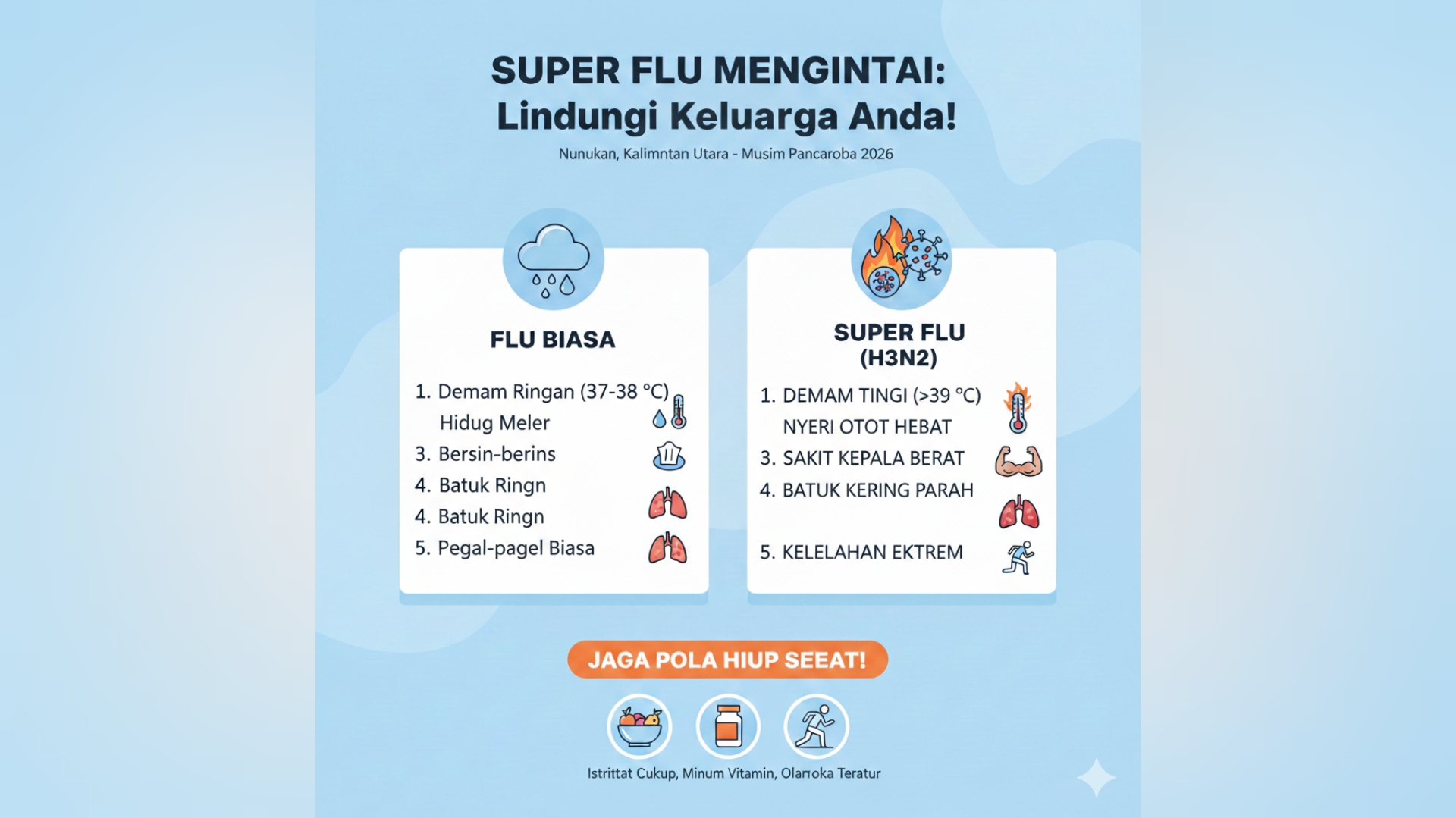 Kepala Dinas Kesehatan Nunukan, Miskia, memberikan penjelasan terkait fenomena tersebut pada Rabu (14/1). Ia meminta warga mewaspadai kemunculan Influenza A H3N2 subclade K atau populer dengan sebutan super flu.