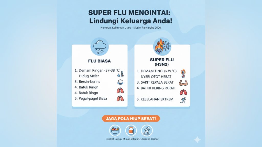 Kepala Dinas Kesehatan Nunukan, Miskia, memberikan penjelasan terkait fenomena tersebut pada Rabu (14/1). Ia meminta warga mewaspadai kemunculan Influenza A H3N2 subclade K atau populer dengan sebutan super flu.