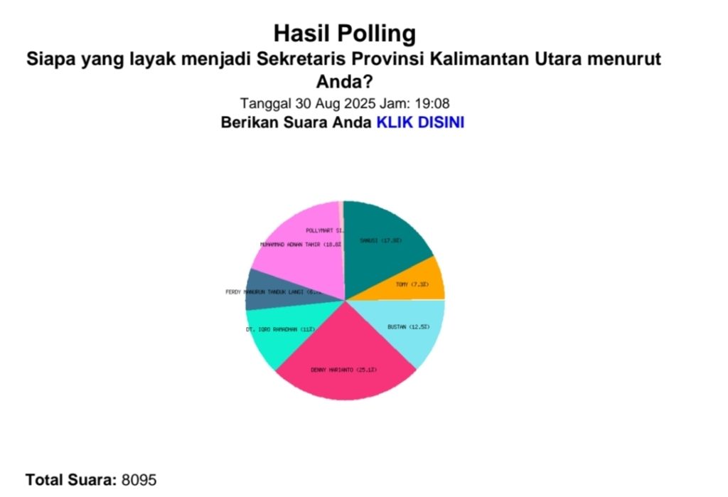 NUNUKAN, KN – Persaingan menuju kursi Sekretaris Provinsi (Sekprov) Kalimantan Utara (Kaltara) makin memanas. Hingga Sabtu, 30 Agustus 2025, pukul 20:08 WITA, tiga nama teratas berhasil memikat perhatian publik. Mereka mengumpulkan suara yang signifikan dalam polling yang Pollingkita.com adakan.