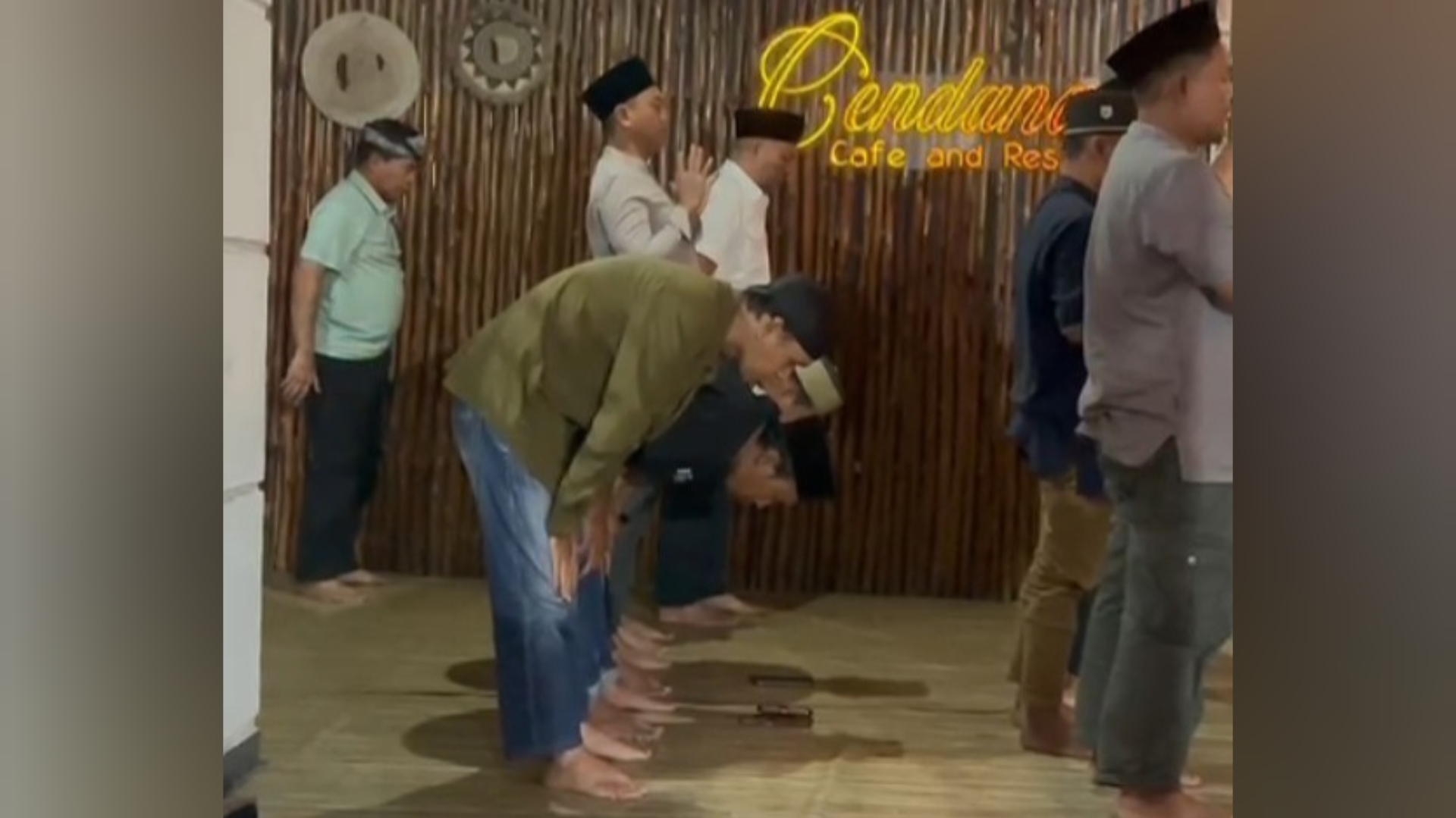 Rombongan bergegas menunaikan salat usai menyantap hidangan berbuka. Kamera ponsel salah satu wartawan menangkap pemandangan unik: sang Gubernur berdiri sendirian mengikut imam dari shaf paling belakang. Ia tertinggal dari rombongan utama yang telah mengisi barisan depan.