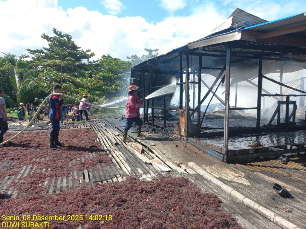 NUNUKAN, KN – Kebakaran hebat meluluhlantakkan satu rumah tinggal di kawasan pesisir, Jalan Mulawarman, RT 04, Desa Bukit Aru Indah, Pulau Sebatik, Nunukan, Kalimantan Utara, Senin (8/12/2025) siang.
