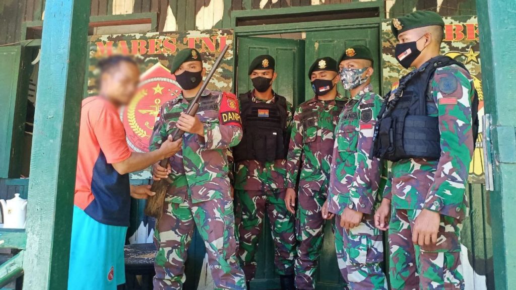 Para tentara di perbatasan RI – Malaysia ini, masih banyak mendapati warga memiliki senjata api untuk berburu.