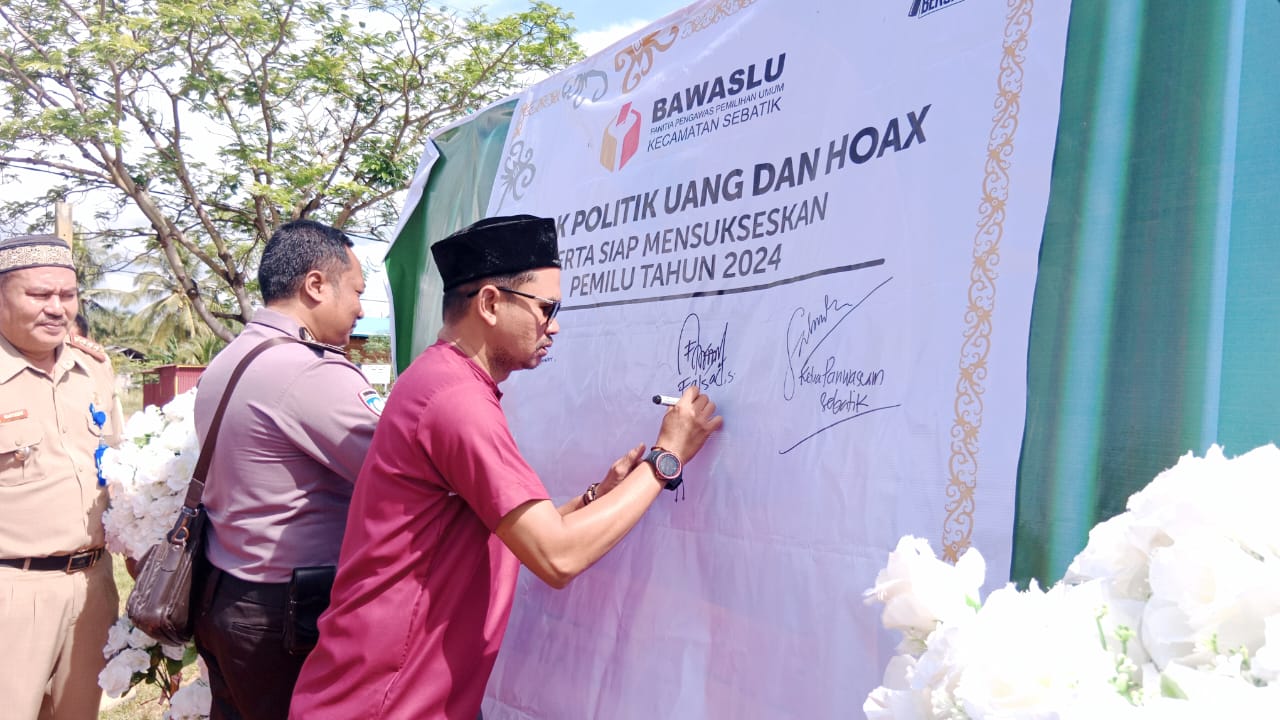 NUNUKAN – Panitia Pengawas Pemilu (Panwaslu) Kecamatan Sebatik dan tokoh masyarakat setempat menggelar deklarasi tolak politik uang dan hoaks di desa Tanjung Karang, Kecamatan Sebatik, Kabupaten Nunukan, KalimantanUtara, Senin (20/03/2023).