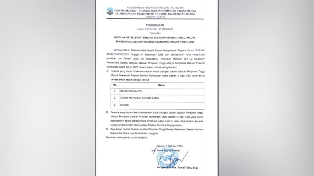 BULUNGAN, KN – Panitia Seleksi Terbuka Jabatan Pimpinan Tinggi Madya Provinsi Kalimantan Utara telah mengumumkan hasil akhir seleksi untuk posisi Sekretaris Daerah (Sekda) Provinsi Kalimantan Utara.